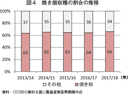 サトウキビの収穫方法は手刈りが主流で、ハーベスタの普及率は約3割にとどまっている。また、収穫作業の効率を上げるために、焼き畑(サトウキビの梢頭部や葉を燃やした後に収穫する方法)が一般的に行われており、製糖工場に搬入されるサトウキビの6割以上が焼き畑によって収穫されたサトウキビ(以下、「焼きキビ」という)とされている(図4、後述)。