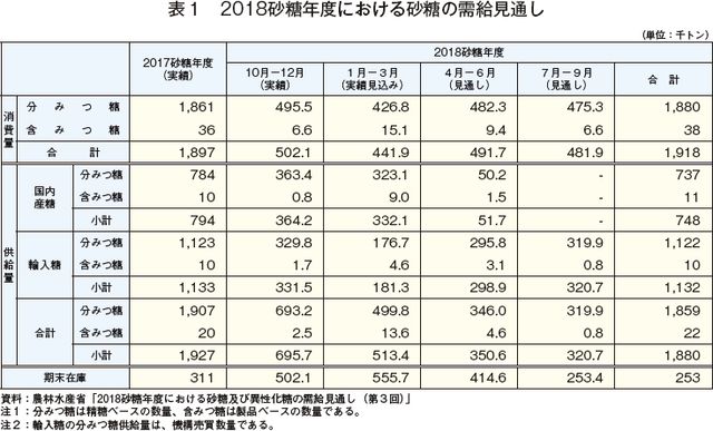 農林水産省は、「砂糖及びでん粉の価格調整に関する法律」(昭和40年法律第109号)により、四半期ごとに砂糖および異性化糖の需給見通しを公表している。3月に「2018砂糖年度における砂糖及び異性化糖の需給見通し(第3回)」を公表した(