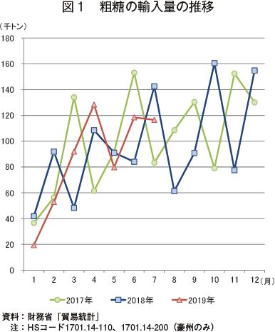 財務省「貿易統計」によると、2019年7月の甘しゃ糖・分みつ糖(HSコード 1701.14-110)および甘しゃ糖・その他(同1701.14−200の豪州)の輸入量は、11万6504トン(前年同月比18.2%減、前月比1.7%減)であった(図1)。