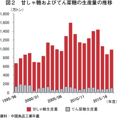 (注)中国政府は2017年5月、輸入品が国内産業に損害を及ぼしているとして、海外から輸入される関税割当枠外(税率50%)の砂糖に対し、最高45%の関税を上乗せする措置を発動した