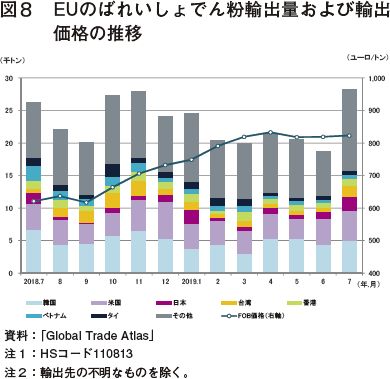 2019年7月のばれいしょでん粉輸出量(注)は、2万8252トン(前年同月比7.5%増、前月比51.0%増)と前年同月からはかなりの程度、前月からは大幅に増加した(図8)。同月の主要国別輸出量は、表7の通りである。