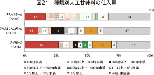 平成30年度の仕入量を種類別に見ると、砂糖、異性化糖ともに「500トン未満」が最も多く、次いで「500トン以上1000トン未満」「1000トン以上2000トン未満」の順となる(図7)。