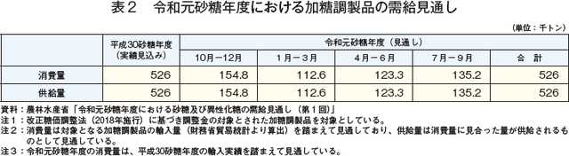 農林水産省は、「砂糖及びでん粉の価格調整に関する法律」(昭和40年法律第109号)により、四半期ごとに砂糖および異性化糖の需給見通しを公表している。9月に「令和元砂糖年度における砂糖及び異性化糖の需給見通し(第1回)」を公表した(