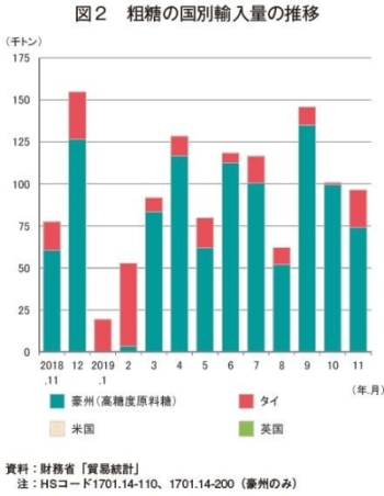 また、同月における甘しゃ糖・その他の豪州からの高糖度原料糖の1トン当たりの輸入価格は、3万5127円(前年同月比7.7%安、前月比7.6%安)であった。