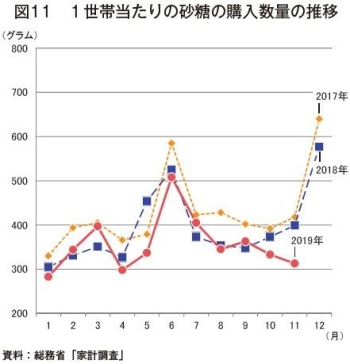 総務省「家計調査」によると、2020年6月における100世帯当たりの砂糖の購入頻度は47、1世帯(2人以上)当たりの支出金額は149円(前年同月比0.7%高、前月比39.3%高)であった(図10)。また、同月の1世帯当たりの砂糖の購入数量は、482グラム(同5.1%減、同28.9%増)であった(図11)。