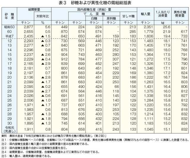令和元年12月に農林水産省が公表した30SYの砂糖の需給見通し(実績)は、表2、3の通り。