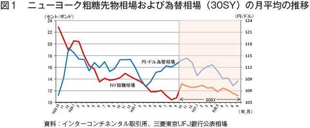 ニューヨーク粗糖先物相場(期近)は、平成28年10月に1ポンド当たり23セント台を記録した後、世界的な供給過剰感を背景に弱含みで推移し、30SY直前の30年9月26日にはインド政府が想定を上回る規模の輸出支援策を打ち出したことから同9.90セントと、20年以来の低水準となった。30SYにおいても、主要な砂糖生産国であるブラジルにおける生産量が前年度よりも増加した影響や、インドの輸出補助金政策の継続などにより、同10〜14セント台で推移した。