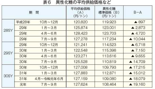 30SYにおける粗糖、加糖調製品糖および異性化糖の平均輸入価格などは表4〜6の通り。