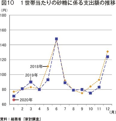 総務省「家計調査」によると、2020年1月における100世帯当たりの砂糖の購入頻度は27、1世帯(2人以上)当たりの支出金額は66円(前年同月比7.0%安、前月比46.8%安)であった(図10)。また、同月の1世帯当たりの砂糖の購入数量は、266グラム(同6.0%減、同50.9%減)であった(図11)。
