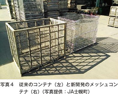 また、従来のコンテナは、組立解体作業に3人の人員が必要であり、組立、解体に多くの時間を要していたのに対し、メッシュコンテナは、折り畳み式となっているため、1人の人員で作業することができるとともに、従来の約3分の1の時間で組立、折り畳みができるようになった。さらに、素材が薄くコンパクトに折り畳めることで、コンテナ返送時の車両積載数は、従来のコンテナがトラックに100基しか積み込めなかったものが、144基と約1.5倍となった。これにより、使用するトラックの台数削減につながっている(写真4)。