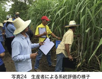 育種過程初期段階における各系統の評価は、主に研究所の育種チームが担当するが、最終段階の現地適応性検定試験では地域の生産者を招き、研究員同様に評価を行ってもらっている(写真24)。ある年の系統評価結果では、基準品種であるKK3より新系統を選ぶ生産者が圧倒的に多かった(図8)。このように実際に新品種を使用する生産者の意見を取り入れることで彼らがどのような品種を求めているかを把握でき、また登録後も新品種を普及させやすいという効果がある。各系統・品種の前には交配組み合わせや単収・糖度などの情報を記したボードがあり、生産者はスマートフォンを使ってQRコードを読み取ることで簡単にそのデータを入手できる(写真25〜27)。