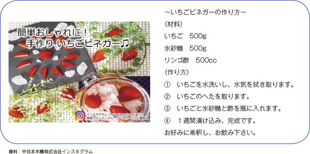 2017年には『レモン酢』、2019年には『イチゴ酢』がテレビ番組で紹介され、フルーツビネガーは消費者からも支持されています。果汁が溶け出すことにより色合いも美しく、注目されているソーシャルネットワーキングサービス(SNS)にも映えるので、全日本氷糖工業組合のホームページ『てづくりライフいろどりライフ』(注)では、SNSと連動して普及活動を行っております。同ホームページでは、フルーツビネガーのレシピおよびレシピ動画を公開しておりますので、ぜひご家庭で作る際に参考にしてみてください。