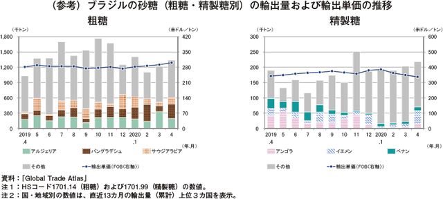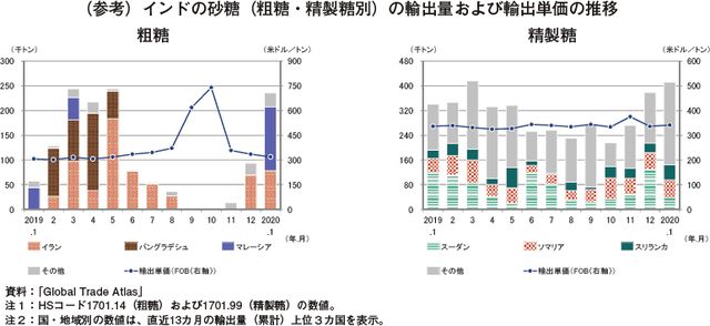 現地報道によると、インドの輸出業者は4月下旬、インドネシアへ粗糖20万トン、精製糖15万トンをそれぞれ輸出する契約を締結したとしている。現状、インド国内のほとんどの港は、COVID-19による都市封鎖によって本格的に機能していないことから、同国西部のムンドラ港のみで船積みされ、5月15日〜20日にインドネシアに到着するとみられる。関係者によると、粗糖の契約金額は1キログラム当たり20.7〜21.0ルピー(32.7〜33.2円〈FOB価格(注)〉、精製糖は、1トン当たり335〜340ドル(3万6180〜3万6720円〈同〉)としている。