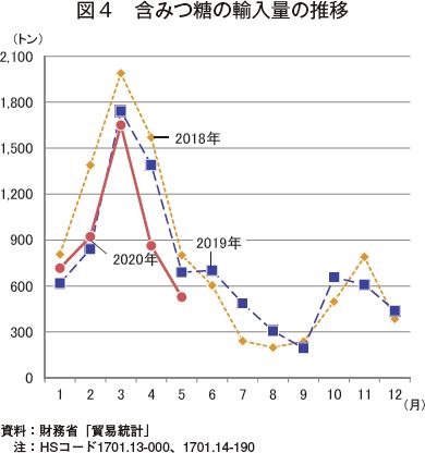 財務省「貿易統計」によると、2020年6月の含みつ糖(HSコード 1701.13-000、1701.14-190)の輸入量は、317トン(前年同月比54.8%減、前月比40.0%減)であった(図4)。