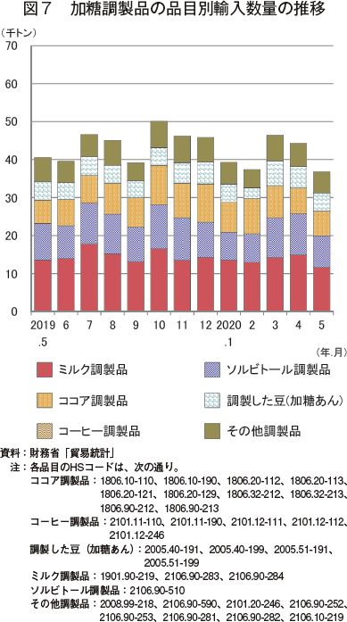 財務省「貿易統計」によると、2020年6月の加糖調製品の輸入量は、4万1046トン(前年同月比3.8%増、前月比11.6%増)であった(図7)。