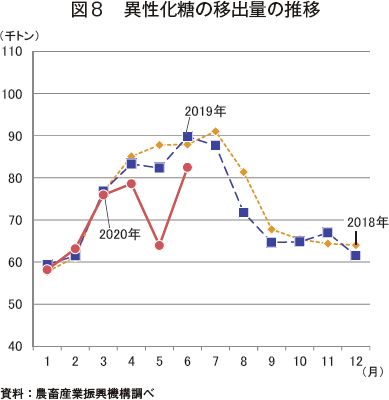 2020年7月の異性化糖の移出量は、8万9094トン(前年同月比1.7%増、前月比8.1%増)であった(図8)。