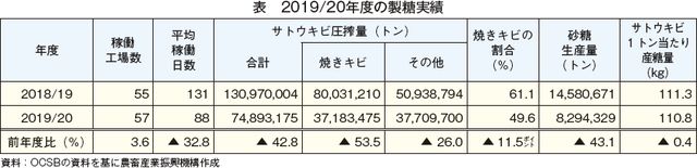 OCSBが公表した2019/20年度の製糖実績によると、焼きキビは3718万トン(前年度比53.5%減)で、全体に占める割合は49.6%(同11.5ポイント減)とかなり大きく減少した(表)。しかし、同政府が2019年2月の規制導入時に発表した焼きキビの削減目標割合である30%には依然届いていない状況にある。