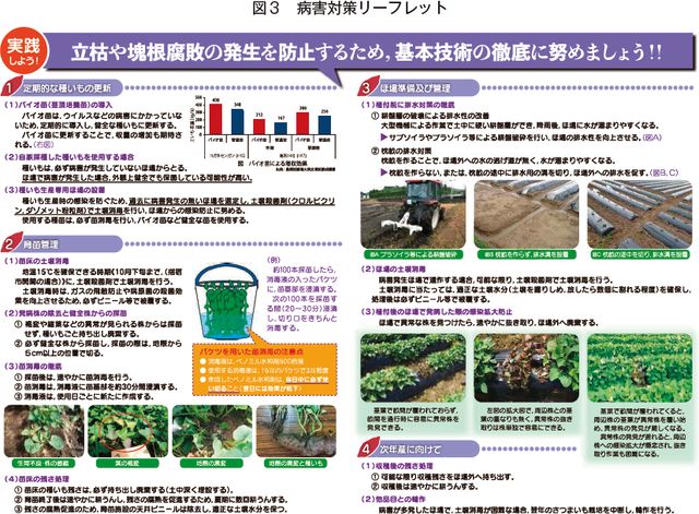 当協議会では、関係機関・団体と連携し、これまでも単収向上に向けた取り組みを行ってきたが、令和元年度は、病害対策に重点を置いたリーフレットの配布(1万2000部)(図3)、栽培技術研修会の開催(令和元年9月)などにより、今年産の病害発生防止に向けて取り組んだところである。