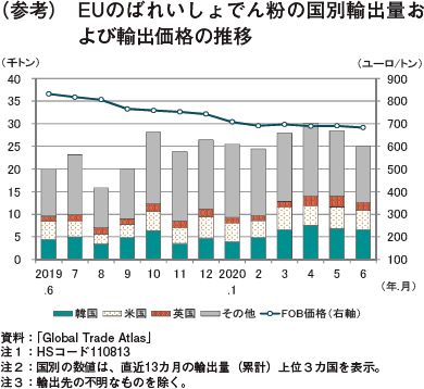 2020年7月のばれいしょでん粉輸出量(注)は、2万6805トン(前年同月比16.6%増、前月比7.4%増)と前年同月からは大幅に、前月からはかなりの程度増加した。同月の主要国別輸出量は、表9の通りである。