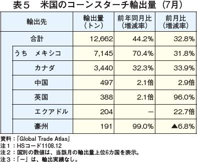 2020年7月のコーンスターチ輸出量は、1万2662トン(前年同月比44.2%増、前月比32.8%増)と前年同月および前月から大幅に増加した。同月の主要国別輸出量は、表5の通りである。