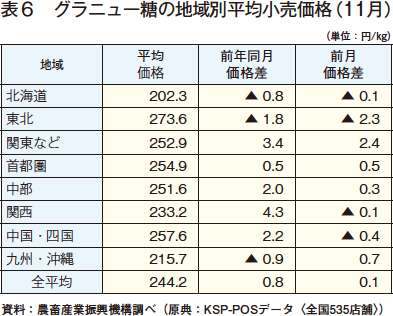 KSP−POSデータ(全国535店舗)によると、スーパーにおける11月のグラニュー糖小袋(1キログラム)の平均小売価格は、244.2円(前年同月差0.8円高、前月差0.1円高)であった。最も高かったのは東北で、最も安かった北海道との価格差は71.3円であった。