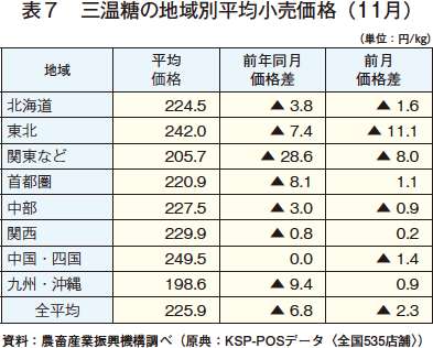 KSP−POSデータ(全国535店舗)によると、スーパーにおける11月の三温糖小袋(1キログラム)の平均小売価格は、225.9円(前年同月差6.8円安、前月差2.3円安)であった。最も高かったのは中国・四国で、最も安かった九州・沖縄との価格差は50.9円であった。
