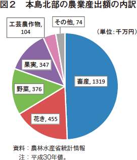 本島北部の大部分の土壌は、赤〜黄色の「国頭マージ」と呼ばれる酸性土壌で、肥沃度は低いが、酸性土壌を生かしパイナップル、かんきつ、茶が栽培できる地域である。本島北部の農業産出額は267億5000万円で、そのうち畜産が49%を占め、中でも養豚が盛んである。次いで、花き17%、野菜14%、果樹13%と園芸品目が続いている。さとうきびを含む工芸農作物は、全体の4%程度である(図2)。