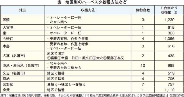 ハーベスタ収穫方法は、地区によって異なる(表)。オペレーターが1人のみの大宜味地区、東地区では、作業はオペレーターに一任されている。国頭地区では、エリアが三つに分かれ、各エリアの収穫を1人のオペレーターが受け持ち、作業はオペレーターに任されている。本島で最も北に位置する国頭地区では、効率的なハーベスタの移動や収穫物の運搬のため、年によって異なるが例えば北側の圃場から収穫を始め、南側の圃場へと移動して収穫を行っている。羽地・屋我地地区も同様であるが、新植への更新予定のある圃場から収穫を行い、その後はオペレーターに任されている。名護地区では収穫順は集落で固定され、喜瀬区→幸喜区・許田区・数久田区→大北区→屋部区→為又区の順で毎年、ハーベスタ収穫が行われている。喜瀬区は、水稲作地域であり、2月中旬から始まる一期米の植え付け準備のため、最初にさとうきびの収穫を実施している。また、生育量の多い順に夏植え→株出し→春植えの収穫、さらには、更新予定のある古株の圃場から先に行うなど、さとうきびの生育や圃場更新の有無で収穫順番を決めている地区もある。金武地区、久志地区、恩納地区では、今年はA区→B区→C区→D区、翌年はB区→C区→D区→A区、というように、地域内で1年ごとに輪番制を取っている。