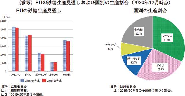 欧州委員会は2020年12月16日、砂糖を含む農畜産物の中期的需給見通しを公表した。これによると、てん菜の単収は1ヘクタール当たり72トン(2018〜2020年の平均値)から、2030年には同75トンまで増加すると見込まれている。てん菜農家の経営状況は、単収の増加と砂糖価格のわずかな上昇によって改善が見込まれ、今後のてん菜栽培面積は140万ヘクタール程度で安定的に推移すると予測されている。また、安定的な栽培面積と単収増加の見通しを受けて、2030年の砂糖生産量は1620万トン(精製糖換算。2020年:1590万トン、同年対比1.9%増)と見込まれている。一方で砂糖消費量は、健康志向の持続などを背景に平均年率0.4%で減少し、2030年には1600万トンまで減少すると見込まれている。