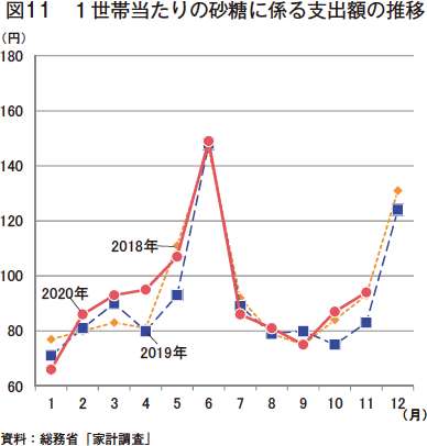 総務省「家計調査」によると、2020年11月における100世帯当たりの砂糖の購入頻度は38、1世帯(2人以上)当たりの支出金額は94円(前年同月比13.3%高、前月比8.0%高)であった(図11)。また、同月の1世帯当たりの砂糖の購入数量は、385グラム(同23.0%増、同9.1%増)であった(図12)。