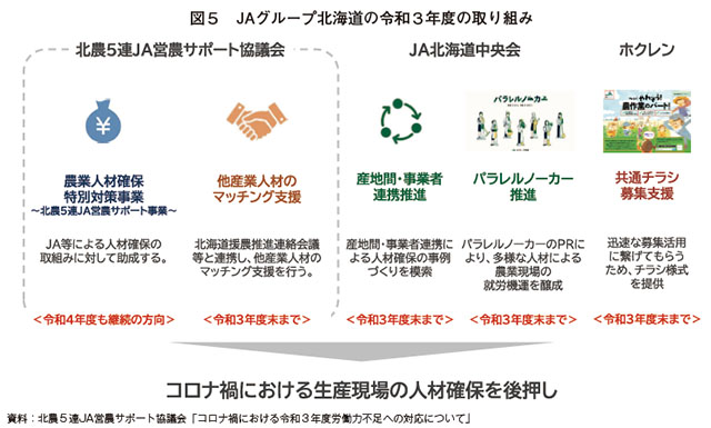 このような状況を踏まえ、北農5連(注1)では、JA等による代替人材確保に向けて、主に四つの取り組みを進めてきた。