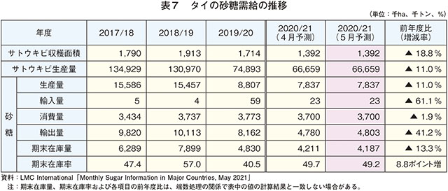 2020/21年度(10月〜翌9月)のサトウキビ収穫面積は、前期作でのキャッサバなどの代替作物の収益性が高かったことから、今期作では代替作物がより多く作付けされたことにより、139万ヘクタール(前年度比18.8%減)と大幅に減少すると見込まれる(表7)。加えて今期のサトウキビ生産量は、前期に続き干ばつの影響を受け、6666万トン(同11.0%減)とかなり大きく減少すると見込まれる。