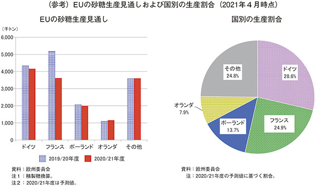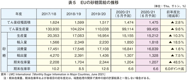 2020/21年度(10月〜翌9月)のてん菜の収穫面積は148万ヘクタール(前年度比2.8%減)とわずかに減少すると見込まれる(表5)。てん菜生産量は、EU最大のてん菜生産国であるフランスで感染が広がる萎黄病の被害を受けて、9946万トン(同9.6%減)とかなりの程度減少すると見込まれる。てん菜生産量の落ち込みにより、砂糖生産量は1521万トン(同10.3%減)とかなりの程度減少すると見込まれる。輸出量は、砂糖生産量の減少によって輸出余力が低下し、133万トン(同7.5%減)とかなりの程度減少すると見込まれる。