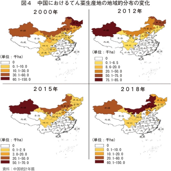 1978年から2020年にかけて、中国のてん菜生産は大きく変化した。1978年以降の作付面積を見ると、1990年代前半にかけて増加傾向で推移し、1991年には過去最高となる78万3000ヘクタールに達した(図2)。しかし、1990年代後半から減少に転じ、2003年以降は10〜20万ヘクタール台で推移している。