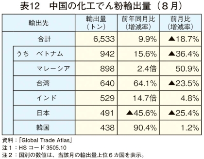 2021年8月の化工でん粉の輸出量は、6533トン(前年同月比9.9%増、前月比18.7%減)と前年同月からかなりの程度増加したものの、前月より大幅に減少した。同月の主要輸出先国別の輸出量は、表12の通りである。