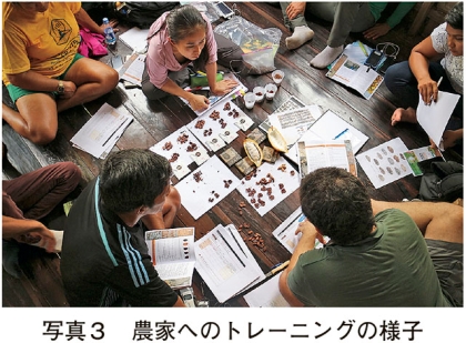 カカオの生育には、強烈な熱帯の日光から実を守るシェードツリーが必要であること、土中に大量の水分が必要であること、熱帯植物の多くがそうであるように受粉に虫が必要な虫媒花であることなどからも、多種多様な樹木と混植することはメリットが多い。また、カカオの木は落葉が多いため、他の作物の良い肥料にもなる9)。その上、世界的に需要が伸びており、また、カカオ豆は適切に乾燥させれば1〜2年は保存できることからも、非常に広範な範囲にまばらに暮らし、市場アクセスが極端に悪い多くのアマゾン農家でも販売することができる。さらに、原産地に近いこの地域では伝統的に育てられている作物であり、世界的にも貴重な野生種も存在する(写真2)。