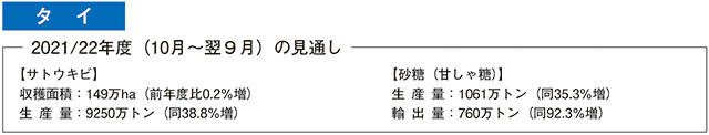 砂糖生産量は、新型コロナウイルス感染症(COVID-19)の拡大による都市封鎖や主力製糖工場での故障などによる稼働率の低下を受けて収穫作業に遅れが出るなどの影響により419万トン(同2.1%減)とわずかに減少すると見込まれる。輸出量は、在庫量の減少を背景に、314万トン(同6.4%減)と依然減少傾向が続くと見込まれている。