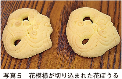 丸い球形の一方がぱっと開き、口を開いたような形をしている揚げ菓子で、サクッとした食感が特徴である(写真10)。