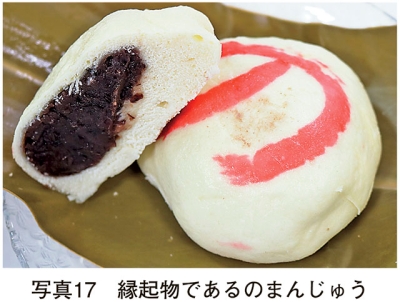 のまんじゅうは、発酵させた厚い皮であんを包み月桃の葉に載せて蒸し、文字通り「の」の字を朱書きしている(写真17)。他のまんじゅうよりも皮が厚いため、皮とあんのそれぞれの味わいを感じることができる。昔から沖縄では祝い事には「の」の字を記し、縁起物として扱われている。