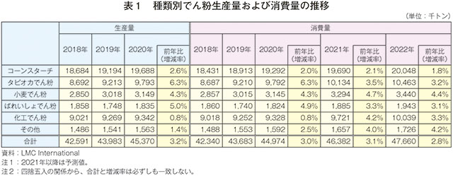 本稿では、世界の主要な天然でん粉(コーンスターチ、タピオカでん粉、ばれいしょでん粉、小麦でん粉)および化工でん粉の2020年の生産・消費動向および2022年までの消費見通しについて、農産物の需給などを調査する英国の調査会社LMC Internationalの調査結果を中心に報告する。