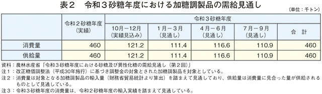 令和3砂糖年度の加糖調製品の消費量は、行動制限の緩和による経済活動の回復が想定されることから、46万トン(前年度同)と見通している(表2)。また、供給量は、消費量に見合った量が供給されると見通している。