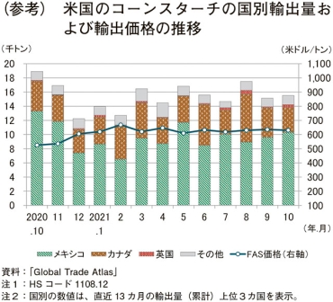 2021年10月の米国のコーンスターチ輸出量は、1万5506トン(前年同月比18.0%減、前月比2.4%増)と前年同月から大幅に減少したものの、前月よりわずかに増加した。同月の主要国別輸出量は、表5の通りである。