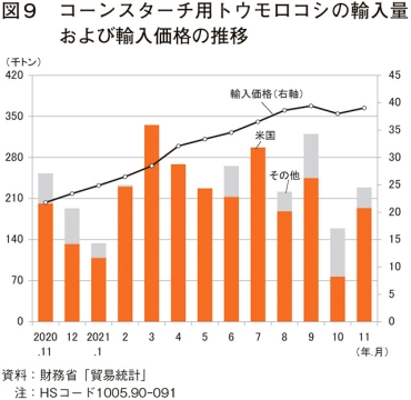 財務省「貿易統計」によると、2021年11月のコーンスターチ用トウモロコシの輸入量は、22万8988トン(前年同月比9.5%減、前月比44.0%増)となり、前年同月からかなりの程度減少した(図9)。