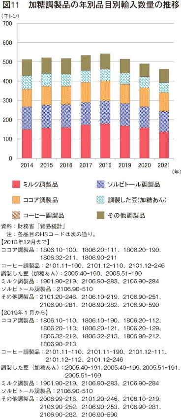 また、2021年1〜12月の加糖調製品の輸入量は、46万1905トン(前年比5.8%減)となった(図11)。