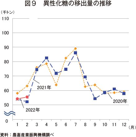 2022年2月の異性化糖の移出量は、5万5530トン(前年同月比6.3%増、前月比2.4%増)であった(図9)。