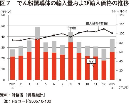 財務省「貿易統計」によると、2022年1月のでん粉誘導体の輸入量は、3万7720トン(前年同月比33.8%増、前月比31.0%増)と、前年同月から大幅に増加した(図7)。