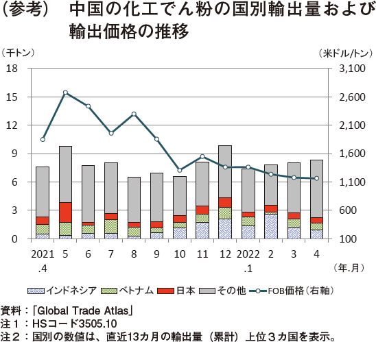 デキストリンおよびその他の化工でん粉(以下「化工でん粉」という)の主要輸出国による主要仕向け先国別輸出量および輸出価格は、以下の通りである。