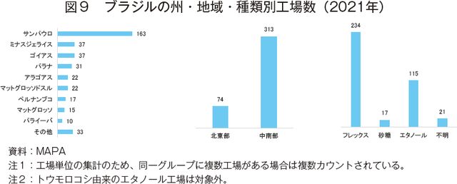 ブラジルの製糖業者の多くは、砂糖とエタノールの両方の製造が可能な「フレックス工場」と呼ばれる工場を有し、その時々の需要や相場に応じた生産調整を行っている。ブラジル農牧食糧供給省(MAPA)によると、製糖工場やエタノール精製工場の6割がフレックス工場であり、製糖専用とエタノール精製専用の工場数を比較した場合ではエタノール精製工場の方が多い状況にある(図9)。