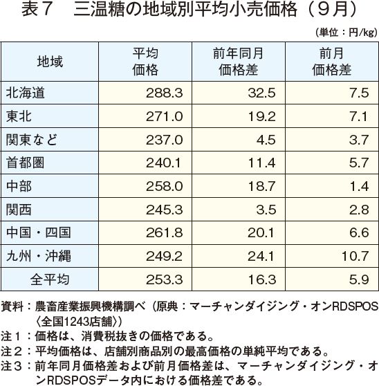 マーチャンダイジング・オンRDSPOS(全国1243店舗)によると、スーパーにおける9月の三温糖小袋(1キログラム)の平均小売価格は、253.3円(前年同月差16.3円高、前月差5.9円高)であった。最も高かったのは北海道で、最も安かった関東などとの価格差は51.3円であった。