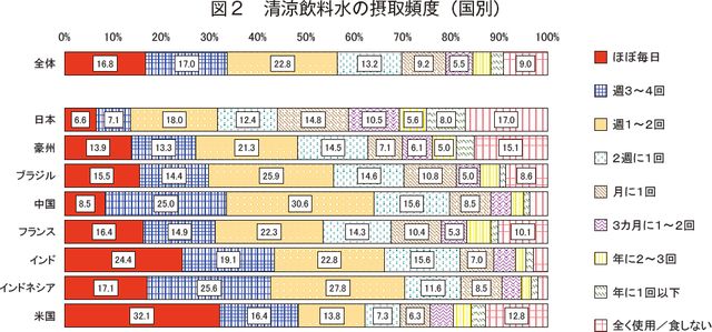 各国の清涼飲料水の摂取頻度を見ると、「ほぼ毎日」清涼飲料水を摂取する者の割合は、砂糖消費量世界第4位の米国(順位はLMC International「Quarterly Statistical Update, September 2022」による。詳細は、